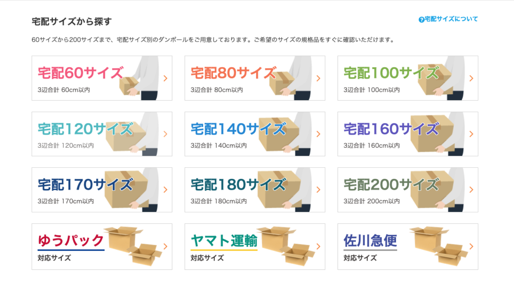 簡潔にいうと「ダンボールの種類がとにかく豊富」。ダンボールや資材を購入するときに想起するのは、アスクルだったりモノタロウだったりAmazonだったりするかと思いますが、ダンボールワンはダンボール専門なので特にかくいろんなサイズのダンボールがあります。