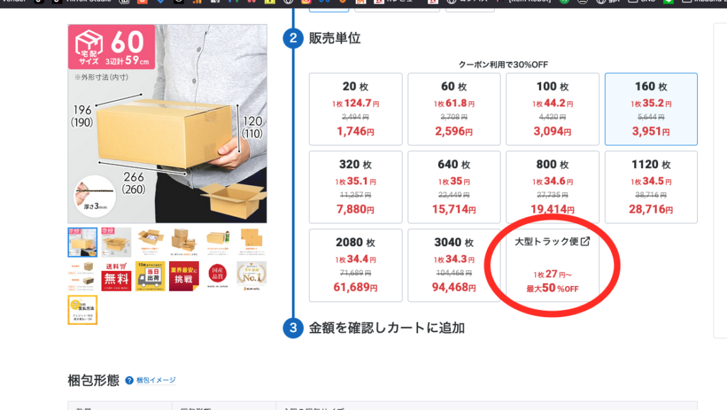 例えば上の商品ですと、3040枚以上同時購入する場合は大型トラック瓶を選択して見積依頼をしてください。見積依頼フォームから1日以内で見積もり回答してくれます。